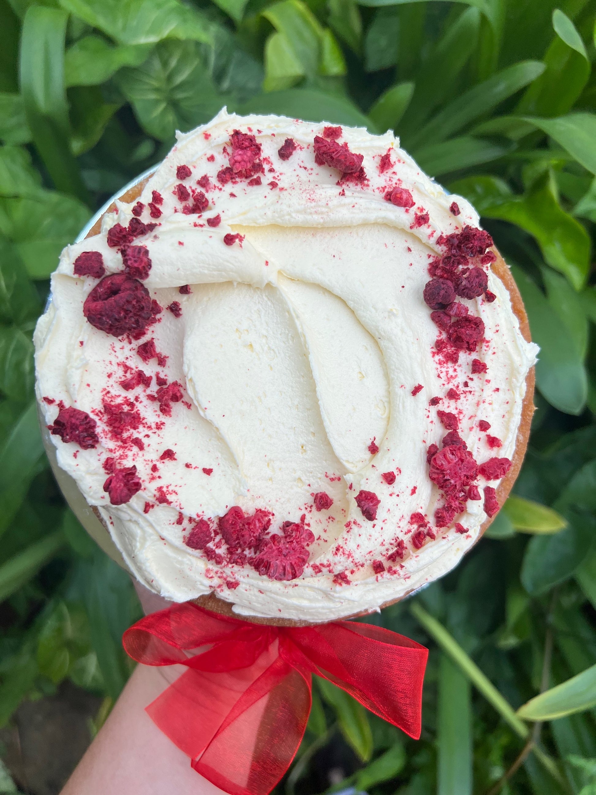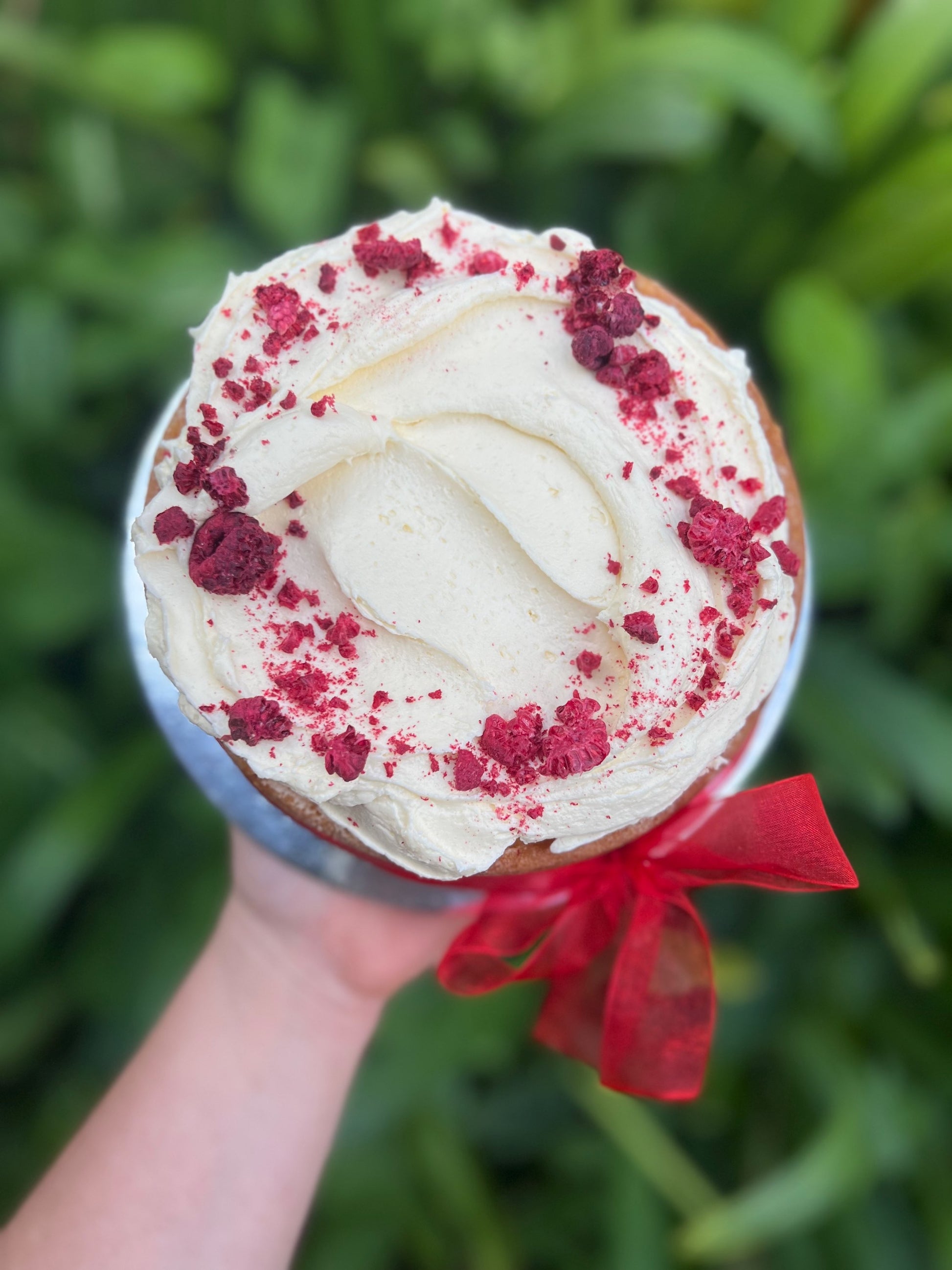 Soft and velvety crumb with a lovely vanilla flavour that melts in the mouth with the addition of tart raspberries dotted through, delicious! Iced with our vanilla buttercream icing